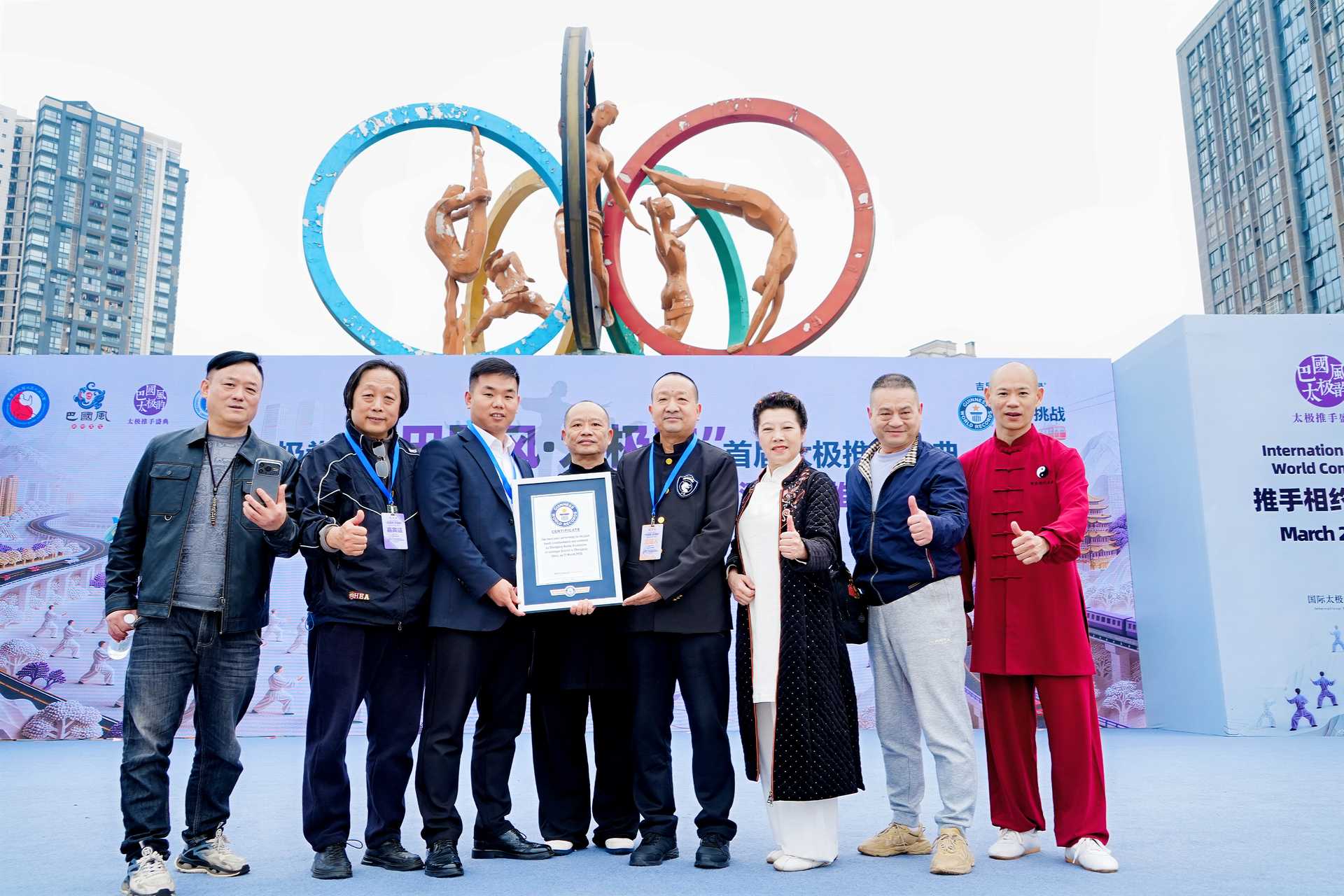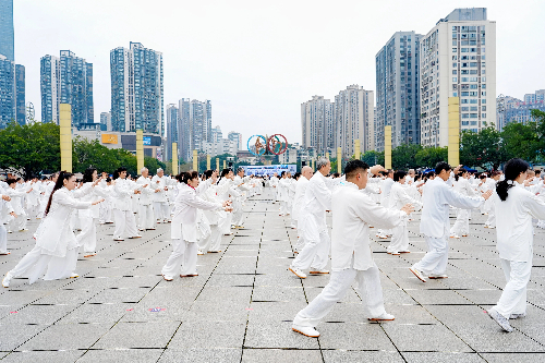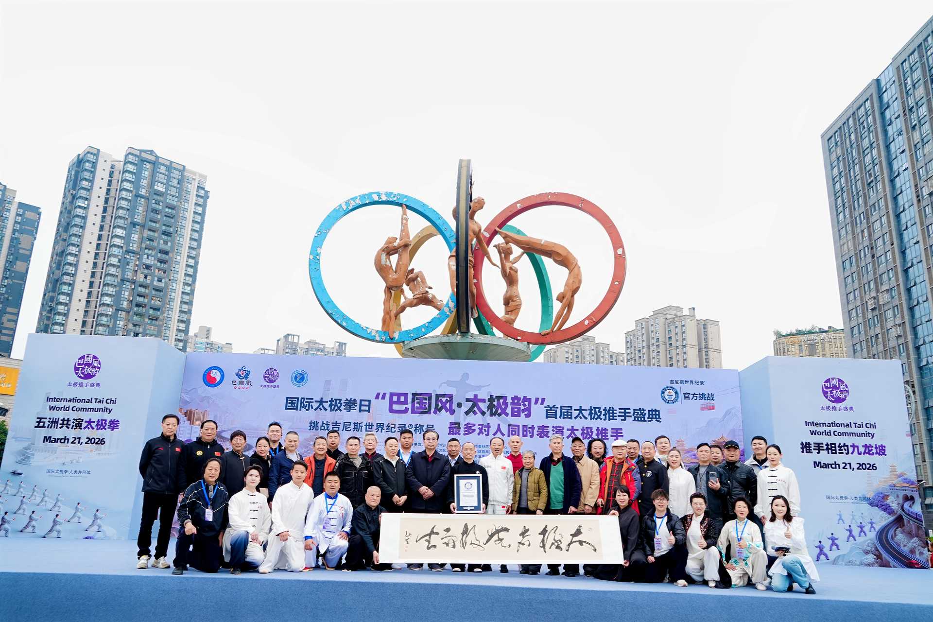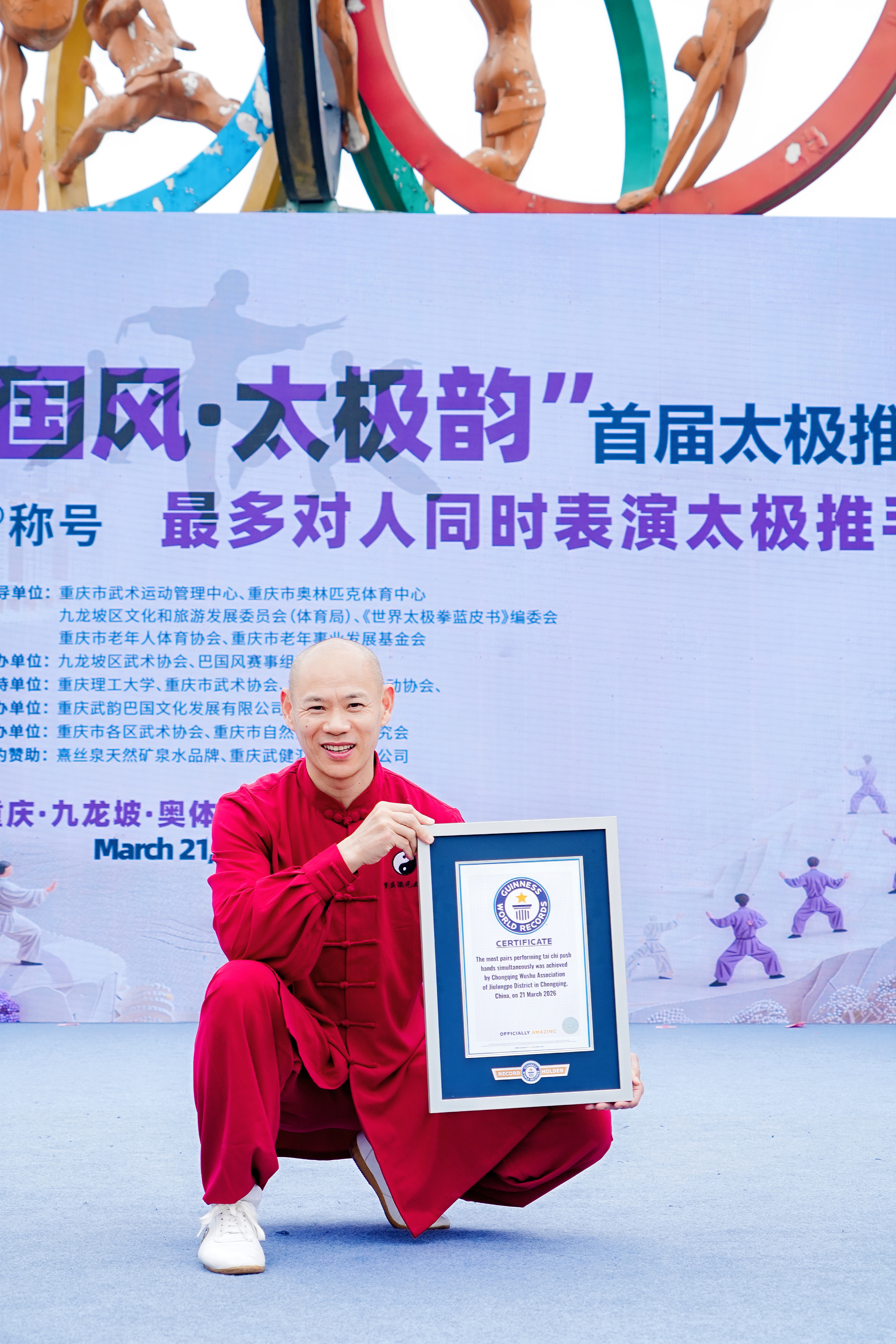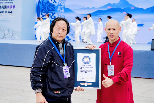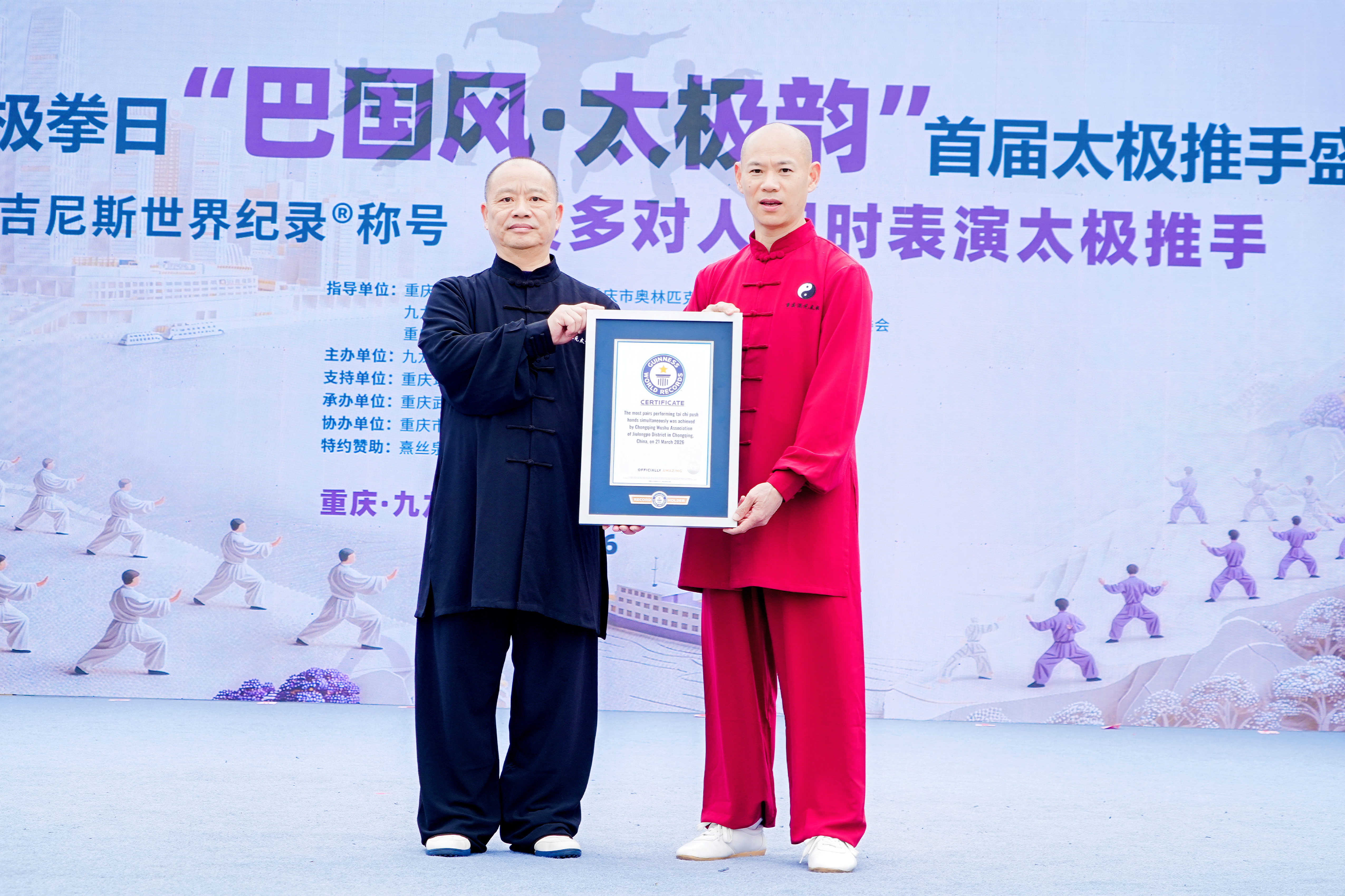 2026年3月21日,首个“国际太极拳日”,重庆市九龙坡区武术协会主办的“巴国风·太极韵”首届太极推手盛典盛大启幕。主会场奥体中心2000余名太极爱好者齐聚五环广场,青海、重庆秀山、永川、大足、万州及重庆理工大学等多个分会场同步联动,共同挑战“最多对人同时表演太极推手”世界纪录,经认证官核验成功获颁吉尼斯证书,为重庆武术再添世界级荣耀。